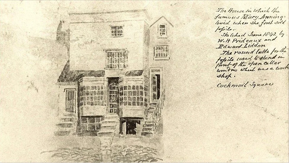 Drawing of Mary's fossil shop, 1842, by W.H. Prideaux and E. Liddon. Source: Wikimedia Commons.